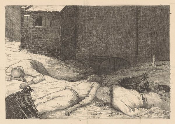 Curator: Welcome! We're looking at Isadore Weiner's "Porch Swing," a 1938 drawing and print rendered in pencil. Editor: Immediately, there's this palpable sense of unease despite the seemingly languid subject matter. The figure's positioning is awkward, vulnerable, and almost voyeuristic, amplified by the high-contrast monochrome palette. Curator: The realism, even in the soft rendering of the reclining figure, has an arresting quality. Notice the composition, with its strong horizontal lines creating a clear foreground, middle ground, and background. The stark contrast, as you pointed out, contributes to its graphic impact. Editor: Precisely. Consider this image in the historical context. It’s the late 1930s, a period of social and economic anxiety. A nude, especially one rendered without idealization, becomes a pointed commentary. It challenges the artifice of beauty standards and perhaps touches upon the vulnerability inherent within the domestic sphere. The ‘Porch Swing’ becomes a space less of leisure, and more of languid contemplation and claustrophobia. Curator: Interesting! Looking closer, I'm drawn to the way Weiner utilizes the pencil. The variations in pressure and density create depth, giving the piece a compelling textural richness, even though the shading overall feels quite flat. The linework defining the swing’s structure seems deliberately rough, a choice that adds to its rawness. Editor: And that 'rawness' you mentioned could be linked to the changing representation of women in art at the time. There was a rise in depicting everyday experiences, and struggles within femininity, often challenging preconceived notions about womanhood and how female figures should be depicted. It also hints at psychological complexities, almost as if the sitter is caught in a private moment of contemplation. Curator: Well, that’s a compelling interpretation, I concede. The contrast between the naturalistic depiction of the nude and the geometric pattern of the porch undeniably creates tension. This piece definitely provides a powerful formal juxtaposition. Editor: Indeed. The convergence of historical context and the work's formal qualities provide so much rich intellectual and emotive ground for exploration. Curator: What a powerful reflection, this piece surely evokes something beyond its initial impression!