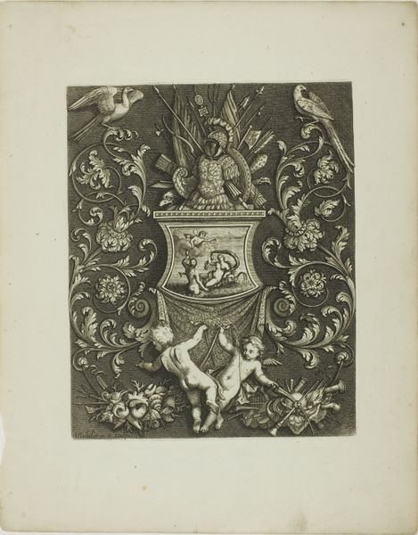 Curator: Welcome. Before us is "Wapenschild van de familie Behaim," or "Coat of Arms of the Behaim Family," an engraving created around 1525. It resides here at the Rijksmuseum. Editor: My first thought is that it is incredibly detailed, given the limitations of engraving techniques at the time. I’m drawn to the way the dense patterns contrast with the stark, open space within the shield on the right. It looks incomplete. Curator: The symbolism is rooted in the Behaim family's aspirations. The heraldic eagle and crown are common symbols of power, signaling a desire for higher social status and recognition within their community and beyond. These armorial bearings played an important public role. Editor: Absolutely. But let’s consider the labour involved in its production. Every line, every dot was painstakingly etched, reflecting a specific process and material engagement. The distribution of such prints offered a visual assertion of familial power, yet its relatively small scale meant it likely circulated among a specific, moneyed class, emphasizing exclusive access. Curator: Certainly. The work's materiality, the very act of printmaking, shaped its reception, controlling who would see the artwork and what kind of symbolic and real power would become visible. This image had meaning within a particular cultural sphere. Editor: The contrast in textures and patterns across the two shields must have taken enormous precision and concentration by the engraver. Consider that these prints functioned within the economy as signs of a family's market position, quite different from tapestries or sculptures owned by aristocracy. Curator: Very true. It's fascinating how such a seemingly small work carries so much historical and cultural weight. I will certainly remember the tension between visibility and accessibility. Editor: Agreed. This work reveals to me the true means and material dimensions of what the Behaim family chose to symbolize about itself at the dawn of the 16th century.
