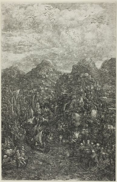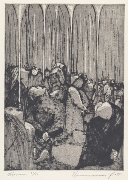 Editor: This print, "The Mob," by Carl Hoeckner from 1935, is… intense. The sheer mass of faces and raised hands feels suffocating. It makes me wonder, what kind of social commentary do you see at play here? Curator: Indeed. Consider the socio-political landscape of 1935. Hoeckner, as an Expressionist, was likely reacting to the rise of totalitarian regimes in Europe. How does the graphic nature of the print—the stark blacks and whites—contribute to that sense of impending dread and loss of individuality? Editor: Well, the lack of detail in the faces, especially in the background, makes them seem like a single entity, a mass rather than individuals. The hands raised uniformly… it feels like blind obedience. Curator: Precisely. The image challenges the romanticized notion of collective action. This isn't a celebration of the people, but a cautionary tale. Note also the platform, like a stage. Who is orchestrating this display? Is it a critique of those who manipulate public opinion through propaganda? Editor: That’s a really interesting point, I hadn’t considered the orchestrator. It gives the image a completely new dimension. Is there any sense of hope in this, or is it purely bleak? Curator: It’s a challenging question. The raised hands, while ominous, also imply agency. However, whether that agency is used for good or ill is the central question the artwork poses. Do you see any variation in the figures that suggests independent thought or resistance? Editor: Honestly, it’s hard to find any individuality amidst that crowd, which I guess is part of the point. I appreciate how looking at this from a historical and political lens adds layers of meaning. Curator: And that is the power of art history – it encourages us to critically examine not just what we see, but the world in which it was created, and the impact of that world on the art.
