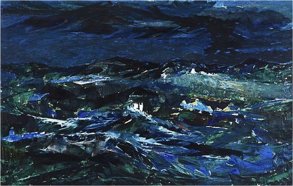 Editor: Here we have "La lumière toujours plus lointaine", or "The Ever Distant Light," created in 1959 by François Arnal using oil paint. It’s very dark, almost monochromatic, but then you see little flashes of white light trying to pierce through the darkness. What do you make of it? Curator: It’s as though Arnal dipped his soul into a vat of ink and then, struggling, reached out for some glimmer, some hope on the horizon. Do you feel the weight of that impasto, that thick application of paint? It’s like he’s physically battling the darkness. Think about Europe after the war – the weight of history, the uncertainty of the future. Matter painting really grapples with these themes, doesn't it? Editor: Yes, you can definitely sense that struggle through the texture of the paint! The monochrome palette makes it feel even more somber, a reflection of post-war anxieties maybe? Curator: Perhaps, or even existential questioning in general? Where *is* that distant light we’re all searching for? Is it political freedom, spiritual enlightenment, a really good cup of coffee on a Monday morning? And why does it always feel just out of reach? Arnal is throwing us into the void here, challenging us to find our own answers. Editor: I hadn’t thought of it like that. I initially just saw darkness, but it’s really about searching for hope in a world that often feels hopeless. Curator: Exactly. And the beauty is, the answers, the interpretations, shift with each viewer, each generation. It's that eternal conversation with the canvas. What a pleasure to delve into it. Editor: I agree, I feel like I learned a new way to look at abstract art. Thanks for shedding some light on this painting!