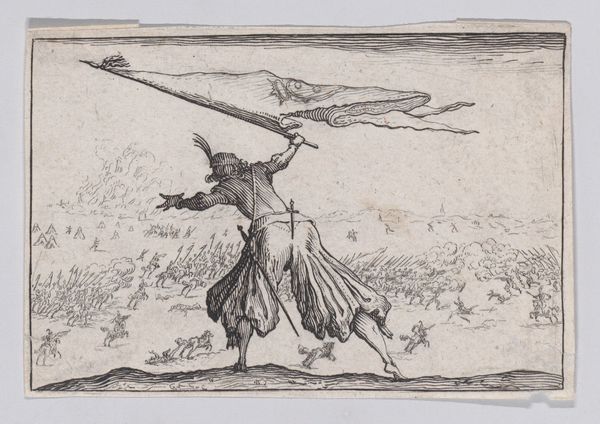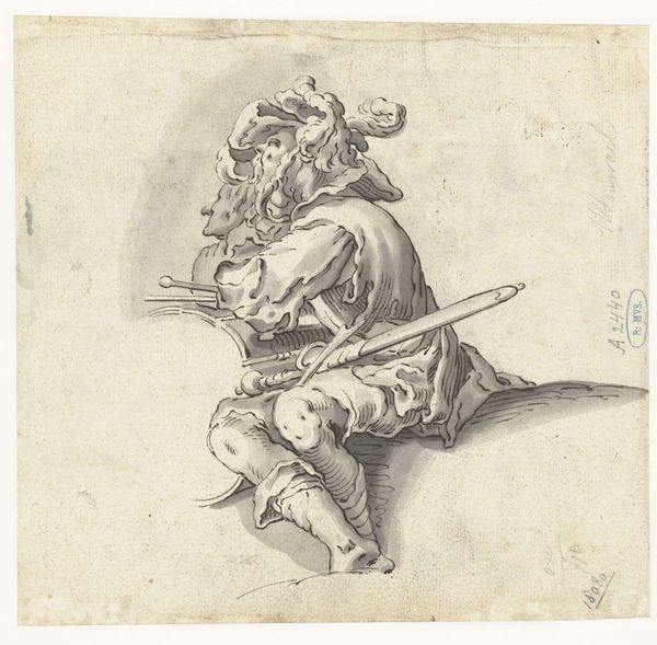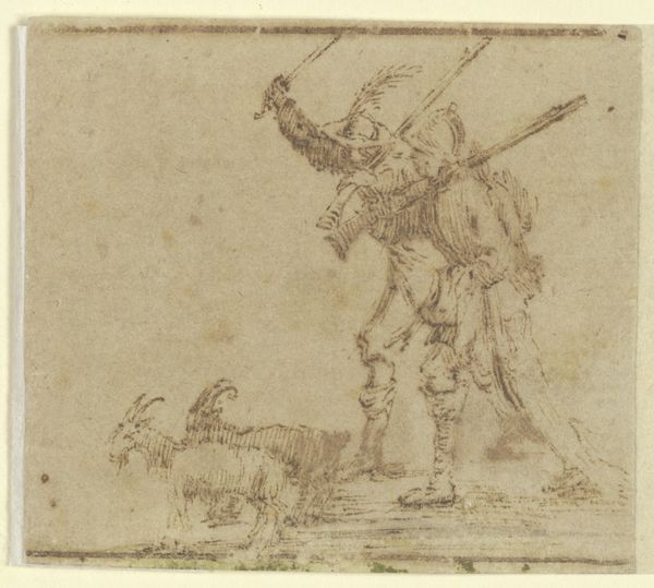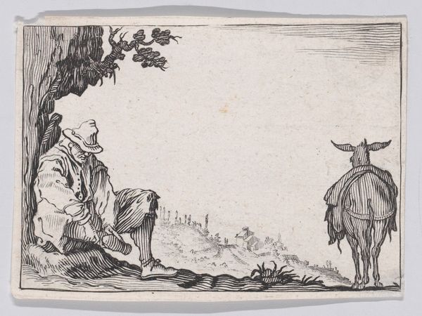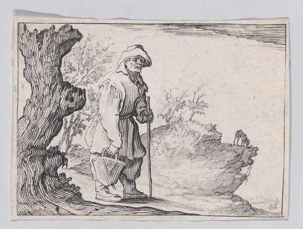 This small print, "Reverse Copy of Le Paysan Portant sa Pelle sur L'Épaule" is part of a series known as “The Florence Set.” Made by an anonymous artist, the image depicts a peasant carrying a shovel. Reflecting the lives of the working class, the print raises questions about labor, value, and representation. Peasants were often romanticized or demonized in art, embodying either an idealized rural simplicity or a symbol of social unrest. This image seems to bypass those stereotypes, presenting a more ambiguous figure marked by the physical toil of daily life. The slight stoop and use of a walking stick might suggest that labor takes a toll on the body. Consider how the artist, while potentially detached from the peasant class, engages with these themes. Does the work evoke empathy, or does it reinforce a social hierarchy? The anonymity of the artist further complicates our reading, challenging the traditional emphasis on authorship and individual expression. It speaks to the collective, often unseen labor that sustains society, prompting us to reflect on who is seen and unseen in the art world.