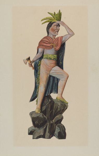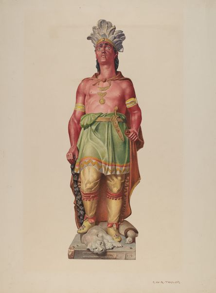 Editor: Here we have Hardin Walsh’s “Cigar Store Indian,” created around 1941, using watercolor. I’m struck by how this seemingly simple depiction holds such complexity in its texture. What do you make of it? Curator: Immediately, the piece declares its engagement with formal structures. Note the interplay between the rigidity of the figure and the fluidity of the watercolor medium itself. This contrast serves not merely as visual information but as a discourse on representation. The colour palette, while subdued, offers a clear study in contrasts—how do you see those colours working together? Editor: The earthy tones create a sense of grounding, yet the pops of brighter colours in the skirt bring an element of vibrancy that counters any sense of monotony. Does this relate to regionalism? Curator: Regionalism as a label often overshadows the careful structuring present within the art itself. Consider the way the lines define form. Are they suggestive of depth, or do they assert the flatness of the picture plane? Notice, too, the way the figure's gaze interacts– or doesn't interact– with the viewer. Editor: Now that you mention it, I see that tension between depth and flatness. Also, I find it compelling how the statue makes no connection with the viewer. Curator: Indeed, Walsh utilizes the formal elements to investigate deeper issues around visibility and objectification. The work’s potency lies precisely in the delicate orchestration of colour, form, and line, creating a composition which prompts contemplation far beyond the easily consumed image. What have you observed from studying the forms so closely? Editor: By shifting the focus to form, I'm learning to detach assumptions and truly see. Curator: Precisely. Art demands that we first look closely. Then, we think critically.