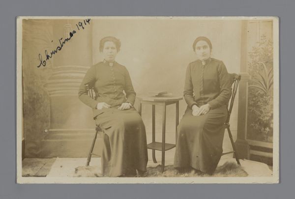 Editor: This is "Liesbeth Quarles v. Ufford en Dora Reub-Arntzenius" by Willem Witsen, a photograph from between 1860 and 1915, held at the Rijksmuseum. It's quite striking how stark and almost confrontational the gaze of the two women feels. What do you see in this piece? Curator: Indeed, there’s a certain directness that cuts through time. The women’s eyes hold a cultural memory; their very posture speaks of a particular social positioning of women at the turn of the century. But it’s not just sociological, it’s deeply psychological too. Note how their proximity creates both a bond and a distinct sense of individual presence. Do you pick up on that interplay? Editor: I do, especially in their expressions. One appears almost reserved, with a softly tied bow, while the other seems more… forthright, almost severe, emphasized by that sharp brooch. Is that contrast intentional, do you think? Curator: Possibly, or it could reflect differing self-presentations, aspects of their identities intentionally displayed. The clothing choices—the details of the bow, the brooch, even the plainness of the blouses—become symbolic of something deeper than mere fashion. These details connect with specific social movements. Think of women's evolving role in that era. Does that connection influence how you see their gazes? Editor: Definitely. Knowing that contextual layer, their expressions become even more charged. There's a sense of both constraint and quiet defiance in them. The natural setting also gives a romantic mood, somewhat contrasting with their frontal pose. Curator: The "pictorialism" style that’s been applied to the image allows the natural and human elements to engage with one another, in tension. This adds to its evocative power. The faces become like landscapes themselves, marked by the subtle forces of societal pressure and personal will. What do you make of that reading? Editor: It’s fascinating how much can be communicated through these carefully constructed visual symbols. I’m seeing this piece in a whole new light. Curator: And hopefully recognizing how the echoes of their era still resonate within our own. These images help us trace the unbroken chain of cultural expression and shared humanity.