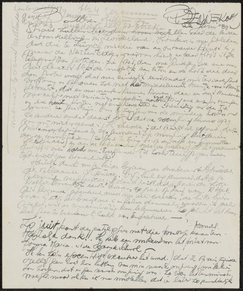 Editor: This is “Brief aan Mien Cambier van Nooten” by Dick Ket, likely from 1939, currently held at the Rijksmuseum. It's an ink drawing on paper, and seeing Ket's tight handwriting gives this work such a personal feel. There's almost an intimacy in reading a personal letter turned into an artistic composition. What catches your eye about this piece? Curator: Ah, yes, Dick Ket. What a soul! For me, his work always whispers secrets. He had a difficult life due to a heart condition; that sense of fragility permeates everything, don’t you think? It’s more than just a letter, isn't it? Look closer – consider how he elevates the mundane into something profound, a snippet of his daily world infused with the intensity of the present moment. Doesn’t it read a bit like visual poetry, of everyday longing and constraint? Editor: I hadn't thought about the idea of constraint playing a role here, I guess I focused on his expression. So the neat handwriting, and overall composition... Curator: Are not merely about relaying information, but a framework! It's like he's meticulously organizing his existence onto the page. You see, it's about finding beauty, about making a moment timeless amidst hardship. It gives insight into the beauty of daily life. What is more precious? Editor: That's such a different way of thinking about a simple letter. I initially looked at this as simply correspondence, but you are right; it is poetry that reveals Ket's spirit! Thank you! Curator: And thank you! Now when I view other "simple" forms like postcards, grocery lists or notes, I'm going to regard them as potential hidden artworks.
