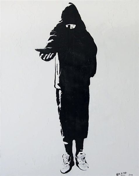 Curator: Here we have Richard Hambleton’s "Standing Shadow" from 2002. It's a striking monochrome painting. What are your immediate thoughts? Editor: Ominous. The sheer blackness against the white feels unsettling, almost like a looming presence or a void. Curator: That's precisely the sort of tension Hambleton aimed for. He was known for creating these 'shadow' figures in public spaces, often using very inexpensive materials, almost a slapdash technique to apply paint. The ephemeral quality adds to the impact. Think house paint thrown up quickly in an alley, and it starts to speak of impermanence, but also of access. Editor: Absolutely, the rawness contributes to that sense of lurking danger. The figure itself, featureless and stark, calls forth collective memories of alleyways and shadowy figures that our subconscious carries. Black, of course, speaks to mourning and despair in Western cultures, yet also evokes authority. Curator: Indeed. And Hambleton's artistic project itself was a reaction to urban decay and the increasing sense of alienation in cities during that period. He sought to disrupt the flow of everyday life, a kind of intervention. It also forces one to consider street art as commodity, what happens when an inherently temporal art form is translated and sold as painting? Editor: The silhouette acts almost like an archetype, the hidden watcher. We all know this person, a character from noir or a personal trauma resurfacing as symbol. Its power derives, perhaps, from its openness; devoid of distinguishing marks, it leaves room for personal associations. I'm curious about the process by which these figures came to be installed initially—quick, cheap, illegal. And now? Curator: A reminder of forgotten spaces and of a disquieting chapter in urban history perhaps, or even art history. Thank you, that's a fascinating interpretation. Editor: A chilling piece; Hambleton definitely knew how to conjure collective fears.