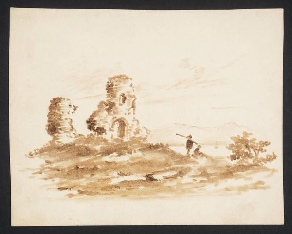 Curator: This compelling pencil drawing is "Landscape with a Tower on a Hill" by Willem Cornelis Rip, created sometime between 1914 and 1916. Editor: The fragility of the lines gives it such an ephemeral quality. The entire landscape seems almost to dissolve before your eyes. It’s haunting, in a way. Curator: The dissolution you describe is especially poignant considering the social and political context of the time. World War I was raging. Landscapes, even seemingly serene ones like this, were being irrevocably transformed, often violently. What does the tower symbolize in that context? Is it resilience, a remnant of a bygone era, or a symbol of the entrenched power structures contributing to the conflict? Editor: Towers have been potent symbols of authority, aspiration, and even isolation throughout history. Consider the Tower of Babel, the medieval watchtowers, or even fairytale towers holding imprisoned figures. Perhaps Rip is tapping into a collective unconsciousness around these forms, expressing a sense of both yearning and entrapment. There's a certain visual rhyme too: the natural formation beneath echoing the manmade architecture atop. Curator: Absolutely. And the lack of detail, the sketch-like quality, it almost renders the tower ambiguous, doesn't it? It's not grand or imposing, it feels... vulnerable, as if it too could be swept away by the changing tides. Editor: Note, also, the delicate shading suggesting an uneven terrain, the stark horizon. Are we looking at solidity or just fleeting geological processes sketched on the run, then caught for just an instance of viewing by our eyes? Curator: The raw quality is striking. And how that starkness emphasizes the landscape itself—suggesting both the permanence of land and the possibility of what could come from it—or of being ruined on it. This feels urgent, despite its muted palette. It whispers a truth about humanity’s fleeting mark on something far greater. Editor: Agreed. A beautiful intersection of artistic observation and societal reflection rendered in deceptively simple strokes. We have been invited into not just the space Rip portrayed but a moment to contemplate on time, hope, loss, and renewal.
