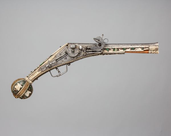Curator: Looking at this wheellock pistol from 1567, you can see a symphony of carving and metalwork. It’s currently held at The Art Institute of Chicago. I must say, the artistry transforms it far beyond a mere weapon. Editor: Intricate. Sinisterly intricate. The patterns dance like frozen smoke, yet you know their purpose is anything but decorative. Does the detail elevate it, or amplify its violent potential? Curator: Well, consider Master I G’s intention—or perhaps the patron’s. Every curve, every inlay transforms cold steel into a status symbol. The grip invites the hand, almost seductively, while promising deadly force. Editor: Precisely! Note the balance here. See how the artisan's decisions about texture and pattern play across the surfaces, both subverting and amplifying our expectations about the weapon, both revealing and concealing. I imagine the user experiences these tensions every time he lifts it, in the moment before pulling the trigger. Curator: But can we divorce ourselves from the immediate assumption of violence? These pistols weren’t exactly mass-produced. More a unique marvel of engineering; art and weaponry intertwined, each influencing the other. Editor: It’s a disquieting seduction, that blend. It reflects humanity's capacity to refine the tools of destruction into objects of fascination. A moral paradox made material. It dares us to see beauty where only death should reign. Curator: Perhaps, then, the true artistry lies in how the craftsman has dared to take raw purpose and remold it, prompting contemplation—a silent commentary on our own conflicting desires and our fascination with beauty. Editor: I couldn't agree more! Thanks to that balance between artistry and intention, this weapon prompts not just fear, but also reflection on what it says about both us, and our history.