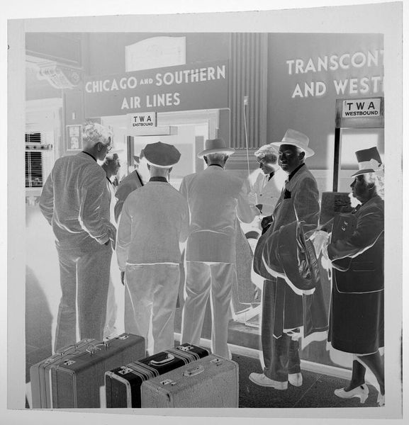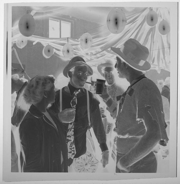 Editor: This is an intriguing untitled photograph by Jack Gould, from the Harvard Art Museums. It looks like a candid shot of three men, and the description mentions inappropriate touching. What do you make of this piece? Curator: Given the title and subject matter, it's hard not to see this as a commentary on power dynamics, particularly within institutions. The "police department" setting suggests a critical look at the labor practices within these organizations, and perhaps even questions of accountability and consent. Editor: How so? Curator: Well, the photograph itself becomes a material document of a specific moment, but also an artifact loaded with social implications. Who is producing the work, who is depicted, and where will the images be consumed? These are crucial questions. Editor: That's a good point. I hadn't considered the photographer's role in capturing and distributing this image. I see how that might be central to its meaning. Curator: Exactly. Examining the means of production invites us to consider who benefits and who is exploited in the process.