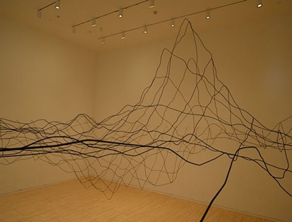 Curator: What strikes me immediately about this is how playful it is. All those rainbow colors wriggling across the wall, and then set against those stern, upright stripes... It feels so optimistic and cheerful! Editor: This is "Wall Drawing #1136" by Sol LeWitt, completed in 2004. LeWitt was a key figure in both Conceptual Art and Minimalism, and here he combines precise geometry with the spontaneity of a hand-drawn line in a large-scale mural. And indeed the piece does generate such dynamic engagement! The mural consists of both straight and wavy colorful lines that move together throughout the work. Do you think the placement of these forms means something? Curator: Placement… well, you know, with LeWitt, it's all about the idea, isn't it? I see the instructions like a little poem, passed on and interpreted each time. It doesn't belong to the wall in the conventional sense; instead it responds, it dances around and inside it... it's more organic than inorganic, the work grows with the support itself... What's more, the instructions may be completed at another gallery if it is purchased. It does give me that sense of community and free spirit I've learned to find at street festivals or political rallies. Editor: Exactly, and thinking about that freedom in relation to form, the wavy lines here are incredibly generative, a concept that brings to mind Deleuze's idea of the rhizome: a horizontal stem with shoots sprouting out where possibilities arise at any point. Does that inform our discussion on Conceptual art too? Curator: Maybe. Thinking about it more abstractly I keep going back to music - like a kind of colorful musical notation. The stripes are like a steady bass line while that serpentine figure dances through and above. There's so much structure here with a hint of a jam session to happen at any moment. Editor: And it’s intriguing how the cool, detached aesthetic of Minimalism merges here with what can feel so emotionally evocative. But LeWitt never seemed interested in "expressing" his feelings through art in any conventional way. Rather, he wanted to foreground the idea itself. A system he created. How the execution is merely the material actualization of that concept. And what do we know of "concept" and system, but an idealist way of reasoning through art-making in itself, isn't it? Curator: In any case, I would simply conclude it does not need all this grandiosity to prove itself. Ultimately, looking at the artwork, I'm feeling both structure and escape... a neat trick, indeed! Editor: A lovely tension to sit with, absolutely. The vibrant structure provides stability to launch a whimsicality and delight!
