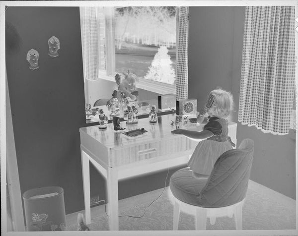 Curator: This photograph, attributed to Hamblin Studio and held in the Harvard Art Museums, is simply titled, "Untitled (one-year old eating birthday cake)". It measures a modest 8 by 10 centimeters. Editor: It's a poignant little snapshot, isn't it? There's a strange vulnerability in the negative tones—like a memory fading at the edges. Curator: Yes, the stark contrast emphasizes the materiality of the photographic process itself. The reversal highlights the chemical processes involved in creating the image and hints at the labor invested in capturing this moment. Editor: But it's more than just process, isn't it? That tiny, expectant face. It whispers of innocence, of beginnings, of the sticky joy of childhood. And cake, of course. Curator: Indeed. The photograph documents a culturally significant ritual—the celebration of a first birthday and a burgeoning consumer culture surrounding manufactured experiences. Editor: I see a fleeting moment, a story unfolding in monochrome. It's a beautiful, melancholic little thing. Curator: Precisely, an exploration of cultural production and personal experience that resonates with simplicity.
