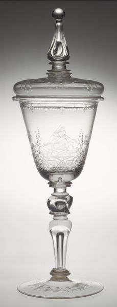 This standing cup was made by Friedrich Winter in Germany around the turn of the 18th century. It is made entirely of glass, and it is decorated with complex imagery. The motifs are classicizing and allegorical; they show idealized figures and ornate patterns. These are visual codes that would have been familiar to Winter’s audience. At this time, glass was becoming ever more fashionable in wealthy circles. Glass-making demanded great technical skill and glass objects were luxury items. Aristocrats displayed objects like this to signal their wealth, taste, and connoisseurship. The cup, therefore, is both functional and ornamental. We can use sources such as inventories and trade records to get a sense of the social context for luxury objects such as this. These objects were highly valued in their own time, and they continue to be valued as works of art and testaments to Europe’s early modern economy.