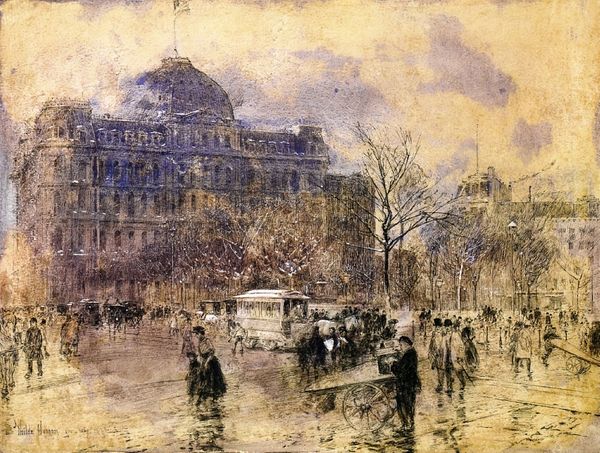 Curator: Looking at Childe Hassam’s "Winter in Union Square," created in 1892 using oil paints, one is immediately struck by the tranquility evoked in the urban landscape. What do you make of this painterly moment? Editor: Immediately, I sense a profound commentary on urban alienation. The blizzard blurs the lines between the classes, between public and private spaces; it presents the street as an unromantic stage where isolation and resilience intersect under a shared blanket of oppression. The artist highlights an experience both communal and yet devastatingly individual. Curator: Hassam's plein-air style really comes through here, capturing the sensory immediacy of a snowy New York day. The layering of paint creates that very sense of a damp chill. Consider the materiality – the thick impasto evoking the density of the snow itself, and the active brushwork! Editor: Indeed, it would be negligent of me not to discuss the societal ramifications for women at the time. Note the figures scattered through the park: isolated individuals moving within gendered confines of society, negotiating both visible and invisible obstructions to movement, expression, and autonomy within the urban landscape of late-nineteenth-century America. Curator: You bring up an important point about how Hassam’s work documented evolving urban experiences. In terms of process, I can’t help but wonder how many layers of paint make up each snowflake, each carriage wheel. The making of it speaks to the industry of the period as well. Editor: Absolutely. This city, so beautiful under its veil, also conceals issues regarding class division, racism and nativism, especially toward the newer immigrant populations. This prompts discussion about how Hassam perhaps consciously, or unconsciously, highlights these inequalities through visual storytelling during this time period. Curator: Right. It seems both of our perspectives shed light on why Hassam's "Winter in Union Square" remains a fascinating piece –one capturing both the process of impressionistic painting and the social climate of its time. Editor: It certainly underscores how aesthetics and lived realities intertwine in this complex dance. Let’s hope conversations inspired by this painting encourage future equitable participation for everybody within urban landscapes across all historical periods.
