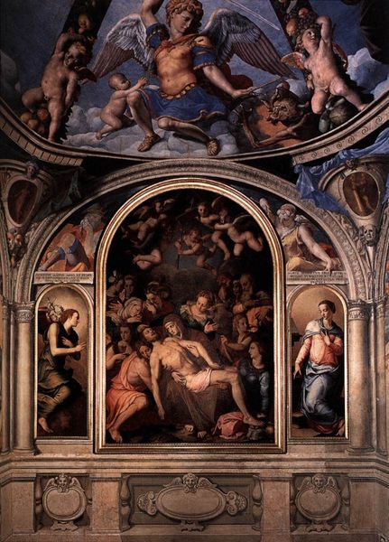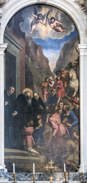 Curator: This piece, "Virgin and Child with Saints" by Paolo Veronese, dating back to 1565, absolutely takes my breath away. There's something incredibly luminous about the color palette; the figures practically radiate. Editor: Well, that’s putting it mildly. My immediate feeling is unease. The contrast between the heavenly vision above and what looks like… martyrdom below? It’s stark. Visually compelling, yes, but existentially… heavy. Tell me more about these materials. What supports all this visual weight? Curator: Veronese, bless his heart, painted it in oil on canvas. And truly, his genius with oils is the key here. The way he builds up those layers of pigment creates such depth, particularly in the Virgin's robes. Editor: Oil paint... readily available pigments, canvas woven into being by Venetian hands, stretched taught over a wooden frame, primed and ready for the application of artistic vision. A booming industry, that Venetian painting scene! Think of all the hands that touched this before it even reached Veronese’s brush. He relies, implicitly, on the means of his own production. Curator: Precisely! And I feel that "implicit reliance" resonates with Veronese’s devotion to the details and the story, specifically the martyr depicted with those ghastly arrows. I find myself drawn into the figures' eyes—such emotion! Their gazes speak volumes about faith, suffering, and the promise of redemption. Does it speak to you? Editor: I keep thinking about the pigments themselves. Where did that vibrant red in the Virgin’s gown come from? Who mined the earth or ground those precious stones? The material reality of creating something so seemingly ethereal is just fascinating to me. And beyond, the canvas ages. Colors change with chemical processes, light exposure, and human interference. These artworks carry such weight of labor, commodification, and time. Curator: Absolutely, there’s an entire history held within this painting's existence as object, a material presence… that gives me a perspective I may have missed before. You know, next time I see it, I'm going to focus on the weave of the canvas itself and think about its origin. Editor: Well, that's the idea: an artwork has lived, been bought and sold, cleaned or neglected... and ultimately testifies to more than just the artistic genius we admire. It exists thanks to global exploitation of earth, animal and person.