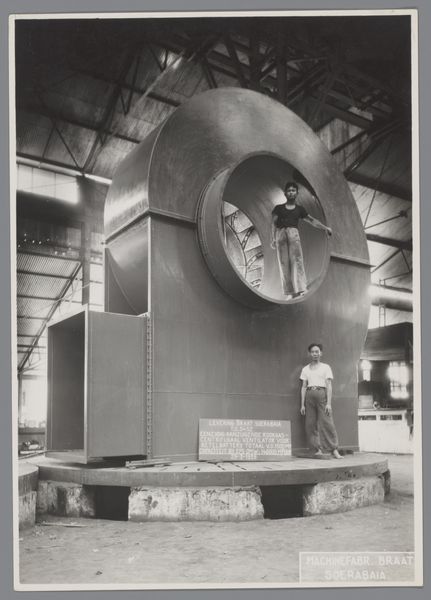 Editor: This archival photograph, possibly taken between 1931 and 1934, depicts a large metal ventilator. The contrast between the imposing machine and the figure standing beside it really strikes me. What do you see in this piece? Curator: Ah, "Ventilator," it breathes a different air, doesn’t it? A mechanical beast rendered with such stark honesty. Look how the photographer has embraced the brutal geometry, the rivets, the sheer industrial weight of it. It feels like stepping into a silent film, doesn’t it? Does it perhaps stir in you a reflection on our relentless, beautiful, destructive drive for progress? Editor: Absolutely! It makes me consider how we often forget the human element within technological advancement. What's interesting is that you called it a "mechanical beast." Is that a common way to look at modernist pieces like this? Curator: In some ways, yes! I find modernism's raw fascination with technology often manifests as a kind of… awe-filled terror. It's as if these machines become modern-day mythological creatures, powerful and untamable. Don’t you think that it is a bit scary to imagine being the man right there? What do you imagine is the next story that this single shot tells? Editor: That makes so much sense. It is an odd shot; it feels caught between admiration and fear, for sure. Thinking about the narrative it tells next, maybe something about the environmental impact or a closer look at the lives of factory workers. Curator: Exactly! See? You are diving into the silent poetry humming behind the brute force and shiny surfaces! Editor: Thanks for shining light on the undercurrents humming in the shot! Now I get why you consider it a mechanical beast, I won't unsee that image.