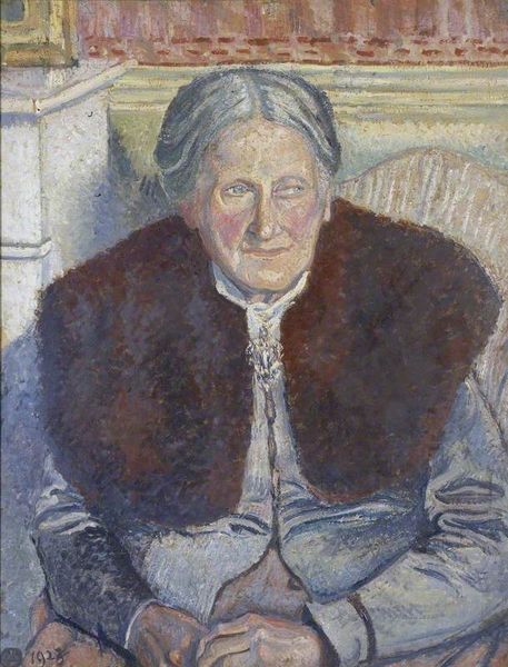 Editor: So, here we have Lucian Freud's "The Painter's Mother III" from 1972, rendered in oil paint. There's a somber quality to the portrait. The texture seems rough, unflinching even, in its depiction of aging. What do you see in this piece from a formal perspective? Curator: Precisely. Notice how Freud manipulates the impasto. The visible brushstrokes, thick and deliberate, don't merely depict form; they *constitute* it. Observe the chromatic scale. It avoids pure tones in favor of a complex interplay of muted yellows, greens, and greys. What does this constrained palette evoke for you structurally? Editor: I guess it gives the painting a kind of internal unity, everything is connected. The greys in her hair, and in her face and shirt. But, doesn’t this muted color range make the overall composition feel… static, almost lifeless? Curator: It could seem that way. But consider it structurally: The almost obsessive detail in rendering the surface of the skin, combined with the relative simplicity of the background flattens the pictorial space. Freud intentionally denies traditional illusionism, pushing the subject forward and creating a raw immediacy. He highlights her inherent structure. What would you say this does to our understanding of the portrait's meaning? Editor: It feels more like an examination than a representation. As if the subject isn't as important as the artist’s act of looking and painting. It's a deconstruction of the sitter, not just a depiction. Curator: Precisely. Through rigorous formal means, Freud offers not just an image, but an experience of encounter, forcing a stark engagement with the materiality of paint and the depicted form. Editor: This really helps unpack how even seemingly muted colours and stark depictions can generate intense visual impact, not just emotionally, but structurally. Thank you.