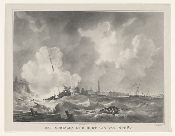 Editor: Here we have an engraving entitled "The Batavian Fleet off Veere, 1800" dating back to the 1800s by Engel Hoogerheyden. The scene is quite turbulent; the ships look like they are battling some formidable waves. What symbols jump out at you in this depiction? Curator: Well, immediately I’m struck by the sky. Notice how the dark, churning clouds dominate much of the composition. Skies in art have often represented the capricious nature of fate, the heavens acting as a stage for human drama. Think of the “ship of state” analogy, very common at this time. The ships here, tossed about, become symbols for a nation facing instability. The image resonates with feelings of vulnerability and helplessness against forces beyond control, connecting deeply with a culture grappling with revolution and shifting power dynamics. What memories did the Batavian Republic seek to pass on? Editor: So, the weather almost acts as a metaphor for political instability? Curator: Precisely. This wasn’t simply a depiction of a naval scene. This becomes, through Hoogerheyden’s skillful composition, a symbolic representation of the anxieties of a nation at sea, struggling for survival and control. Even the low vantage point invites viewers to identify with that experience of feeling overwhelmed. What is the symbolic importance of placing Veere off in the distance? Editor: That is fascinating – it really shifts how I viewed the piece! The ships aren't just ships; they represent the entire country fighting against turbulent currents of revolution. The small distant cityscape highlights what's at risk. Curator: Indeed. Art from this era often functioned on multiple symbolic layers, speaking to immediate events while tapping into deeper cultural anxieties and aspirations. Now consider this work's role in constructing the collective memory of the Batavian Republic... Editor: That offers much to consider and look at artworks of this period. Thanks.