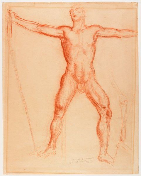 Curator: Isn't that interesting, the artist really seems to have worked those leg muscles... But, well, let's dive in. We're looking at John Singer Sargent's "Study of Orpheus for 'Classic and Romantic Art'," a pencil drawing from around 1921. Editor: Orpheus... it’s interesting that he's portrayed in a moment of intense expression, almost anguish, despite being just a sketch. There is a sense of urgency and desperation coming from him. You almost want to fill in the emotion to understand what exactly happened. Curator: Right, Sargent was doing studies for a mural commission, you see. So, the Orpheus here is about conveying feeling, almost raw emotive force, not some passive ideal figure. Sargent, the portraitist of elegance and leisure, really puts this figure to hard work. What kind of tradition is he pulling from here? I wonder if it speaks to something of his own attitude toward commissions late in his career. Editor: The mural commission really provides the historical context to the picture here, which seems so loose. Sargent worked a lot in those established channels. Considering the grand narrative ambitions inherent to the genre and style, I see an exercise of translation here, bridging a storied classical subject and a modernist sensibility. This drawing really focuses our attention on the raw physicality, a quality not traditionally associated with mythological figures. Curator: Exactly. He’s really wrestling with the subject in his technique and his vision. Those bold strokes and anatomical explorations aren’t simply academic exercise. Editor: Indeed. The medium underscores its nature as a study; pencil isn't about the grand statements like the historical painting but that moment of active engagement. Curator: Well, looking closely makes me reflect on how even preparatory studies can communicate feeling and the inner, working doubts that an artist expresses in an interesting stage of their career. Editor: And, seeing the artist use modern approaches and media adds another layer of interpreting a historical figure like Orpheus, adding dimension and complexity to understanding the legacy.