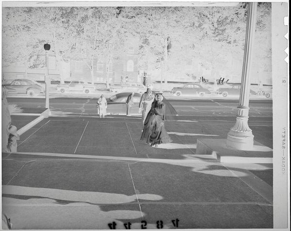 Editor: Here we have an untitled photograph by Lucian and Mary Brown, depicting a family outside a house in the snow. It’s small, just 4 x 5 inches, and the negative gives it an eerie feel. How do you interpret this work? Curator: It's fascinating how the inverted tones disrupt our expectations of domesticity. Who is included and excluded from this vision of "family"? Whose gaze are we invited to occupy, and how does it affect our understanding of belonging? Editor: That's interesting. It seems like the photographer is also outside the scene, separate from the group. Curator: Exactly. This raises important questions about perspective, power, and the ways photographic representation shapes our understanding of social structures. The lack of a title encourages us to actively engage with these ambiguities. Editor: I hadn't thought about it that way. The anonymity makes the image more universal, perhaps? Curator: Possibly. It certainly invites a broader discussion about family, representation, and the complexities of social inclusion and exclusion.