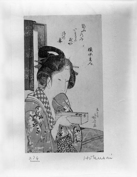 Editor: So here we have Utagawa Kunisada's woodblock print of "Actor Ichikawa Danjūrō 7th Preparing New Year's Gifts." I'm struck by how intimate it feels, like we're peeking into a very personal moment. What do you make of it? Curator: It's a backstage pass, isn't it? Kunisada lets us see not just the actor, but the person preparing for the social rituals of the New Year. Notice how the severity of his face contrasts with the joyful occasion, or with the plum blossoms on the screen; the actor's persona is carefully built, shaped. The letters might be an invitation to imagine the actor’s personal life. What do you think? Editor: It makes me wonder about the actor's real feelings versus what he presents to the world. Curator: Exactly! And that tension, I think, is what makes this piece so compelling. Thank you for pointing that out.