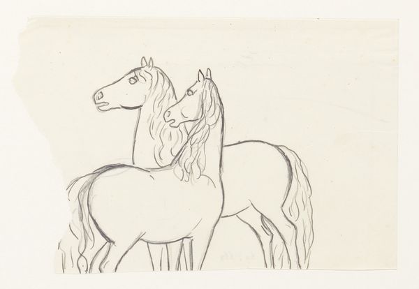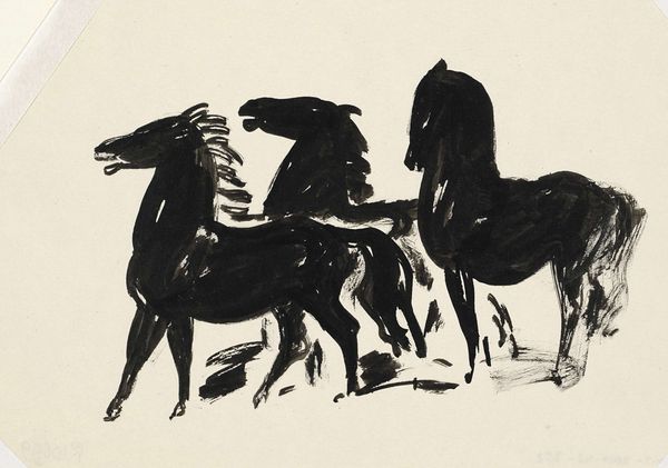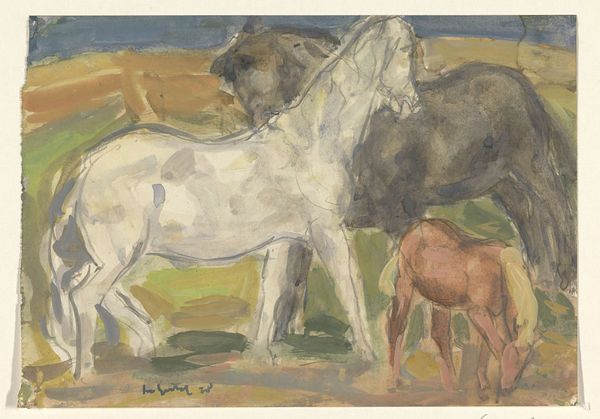 Editor: We’re looking at Cyprián Majerník’s "Horses," painted in gouache around 1936 or 37. There's a kind of flattened quality to the forms, almost like a child’s drawing, but with a strange underlying tension. What can you tell me about the materiality of this piece? Curator: Well, consider gouache, often seen as a 'lesser' medium than oil, traditionally used for studies or illustration. Majerník elevates it here, using its opacity to create solid blocks of colour and de-emphasize any painterly depth. Note how the pigment sits on the paper, drawing attention to its own presence and process. Editor: So you're saying the *how* of its making is as important as the *what*? How does this impact meaning? Curator: Precisely. Think of the socio-political context: it's pre-war Czechoslovakia. The naive style can be viewed as a deliberate move away from academic traditions, embracing a rawer, perhaps even "folk" aesthetic, potentially as a comment on national identity, on artmaking itself. Look how the land seems compressed, the animals solid forms in a fabricated setting; in doing this, the means by which this scene is conveyed gains additional import. Does that resonate with you? Editor: Absolutely. It feels less like a depiction of horses and more about the very idea of them, flattened and processed. The materiality highlights the conscious crafting. Curator: Exactly! It makes us question what is being communicated, what these figures and that scene represented and stood for during that era. Editor: I hadn't considered the process of using gouache as a conscious choice with real socio-political weight. It really shifts my understanding. Curator: And it’s precisely that interplay between the artist, materials, and historical moment that unlocks a deeper engagement with the work, I'd say.