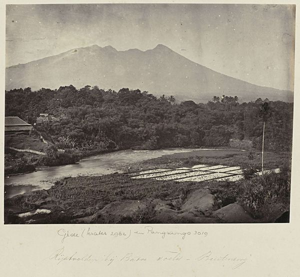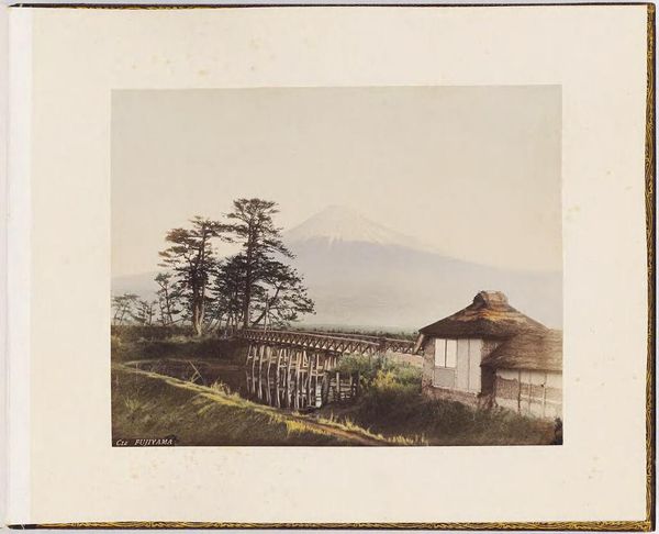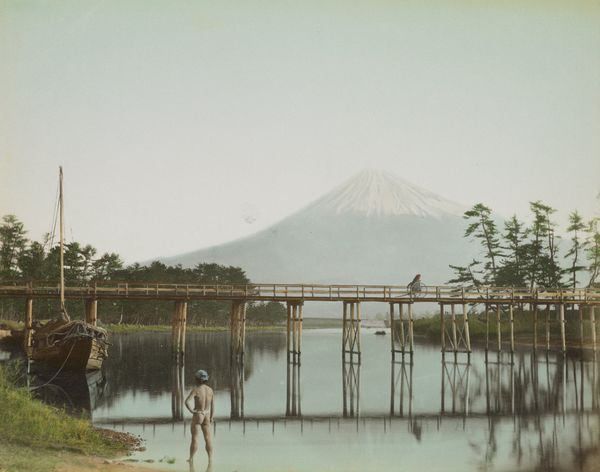 Kusakabe Kimbei captured this albumen print around the turn of the century, presenting a view of Mount Fuji from Omiya village. The composition arranges natural and human elements into a harmonious whole. The tranquil river in the foreground leads the eye towards the village, nestled amid trees, culminating in the majestic form of Mount Fuji. The cool blues and whites of the mountain contrast with the warmer tones of the landscape, creating a visual balance. The fisherman in the front adds a human element, emphasizing the scale of the mountain. The photograph operates within a visual language of signs, where the mountain symbolizes permanence, the river represents the flow of life, and the village stands for human settlement. Kimbei uses this semiotic system to explore the relationship between nature and culture, emphasizing the harmony between the Japanese people and their environment. It's a constructed image, yet one that invites contemplation on the interplay between these forces, reflecting a nuanced understanding of place.