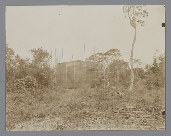 Curator: Here we have a fascinating anonymous photograph, entitled "Bouw van een woonhuis," taken sometime between 1914 and 1919. It documents the construction of a house. Editor: It strikes me immediately as something skeletal. All these wooden beams crisscrossing each other give a strange feeling of vulnerability, even in the process of creation. You can see the landscape seeping into this structure in a constant dialectic. Curator: Yes, that interplay between the built environment and the natural world is so central to this piece, isn't it? The surrounding landscape isn't just backdrop; it is completely integrated into this image. One is naturally driven to the politics involved. One could even argue that this house represents not only the development of an architectural site but also highlights social inequalities, as access to land and construction has historically been determined by race and gender. Editor: Exactly! And if you consider the material itself, the wood, it speaks volumes about labor and access to resources during that time. I am deeply drawn to the evidence of process visible everywhere. Look at the stacks of lumber in the foreground! They draw one's eye into all of the specific labor and the lives tied up in those resources. Also that brick wall in the middle of this structure. This is how wealth is materialized! Curator: Precisely! Thinking about the medium too – photography itself, especially at this time, also plays a crucial role in shaping perceptions of progress, modernity, and colonialism, by allowing for the ability to capture and document. How images could either support existing racial and class power imbalances, or actively interrogate them, even expose them. Editor: This interplay is especially intriguing because the photograph captures the building mid-construction, it's almost performing or highlighting its constructed nature—as a result, even as it seems fragile, it becomes hyper-visible. I will walk away from this photograph now contemplating this intersection of progress and what the actual cost is for certain groups, especially manual labourers who work to build things. Curator: Absolutely. It provokes a reflection on whose labor built it and who would ultimately occupy it, and in that, it is a photograph that speaks directly to the power dynamics embedded within the seemingly simple act of building a home.