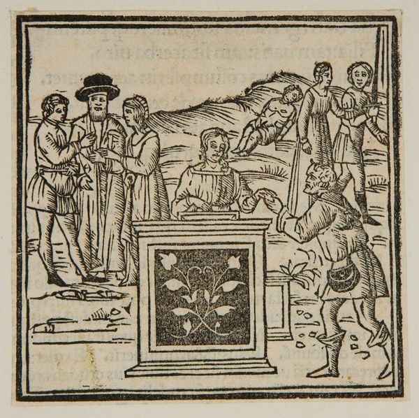 Editor: Here we have Holbein the Younger's "1 Chron. XVI," a black and white print. It's striking how the figures are packed together, all seemingly focused on the central, seated figure. How do you interpret this work in its historical context? Curator: This print was likely part of a series, aimed at a wide audience during the Reformation. The choice of biblical scenes, rendered in easily reproducible woodcuts, democratized religious imagery. Consider the role of such images in shaping public opinion and religious discourse. Editor: So, it's not just art, but also a form of religious and perhaps even political communication? Curator: Precisely. Holbein's work became part of a larger visual culture influencing social and religious identities. These inexpensive prints gave people access to art and ideas. Editor: That's a great reminder that art exists within broader social and cultural currents. Curator: Indeed. It highlights the power of images in shaping collective beliefs and narratives.
