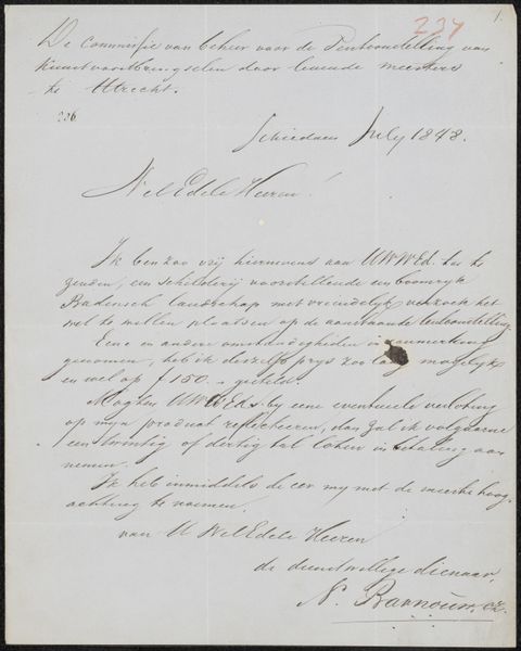 Curator: Here we have something quite delicate: "Brief aan de commissie van de Tentoonstelling van Levende Meesters in Utrecht," which translates to "Letter to the Committee of the Exhibition of Living Masters in Utrecht." Attributed to Johannes Verhoogh and possibly dating back to 1848, it's ink on paper, displaying beautiful handwriting. What springs to mind for you? Editor: It feels incredibly intimate. Almost like sneaking a peek into someone’s private correspondence. There’s a fragility to it, emphasized by the aged, toned paper and the faded ink. Like holding a whisper from the past. Curator: Exactly! The handwritten quality immediately pulls us in. Notice the graceful flow of the calligraphy, each stroke imbued with personality. Calligraphy wasn't just about communication; it was about imbuing writing with artistic expression. Editor: It's the imperfections, too. The slight unevenness in the letters, the subtle variations in the ink pressure. Those little flaws give it so much character. Mass-produced text lacks this sort of tangible human touch. What can you say about the cultural context of letters and handwriting in this period? Curator: Absolutely. In that era, handwriting reflected one's education and social standing. The letter form itself served as a cultural ritual, often imbued with symbolic meaning depending on the occasion, tone, and recipient. The language used here is formal, respectful. This suggests a certain protocol and decorum were meticulously observed. Editor: I find myself imagining the artist sitting down with his pen, carefully choosing his words, conscious of the impression he wanted to make. What I also love is how this piece seems to blur the lines between art and document, personal expression and historical record. Curator: That duality is compelling. This letter gives insight into the art world of the mid-19th century Netherlands, shedding light on how artists sought recognition. Editor: So, more than just ink on paper; it’s a portal to another time, to the hopes and anxieties of an artist seeking his place in the world. It feels wonderfully melancholic. Curator: A sentiment that beautifully encapsulates the enduring appeal of this piece. The blending of artistry and communication preserves a uniquely historical echo.