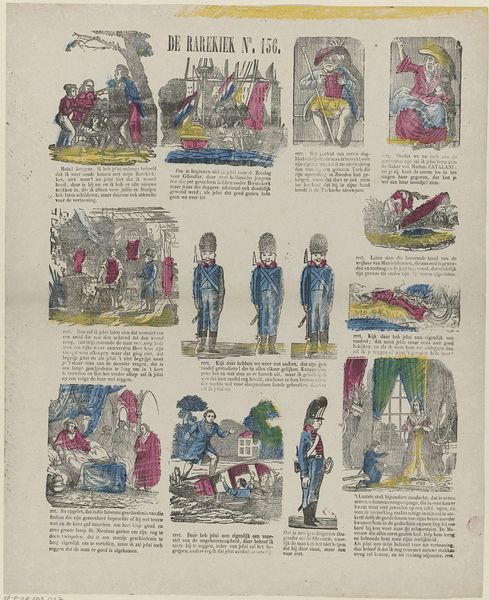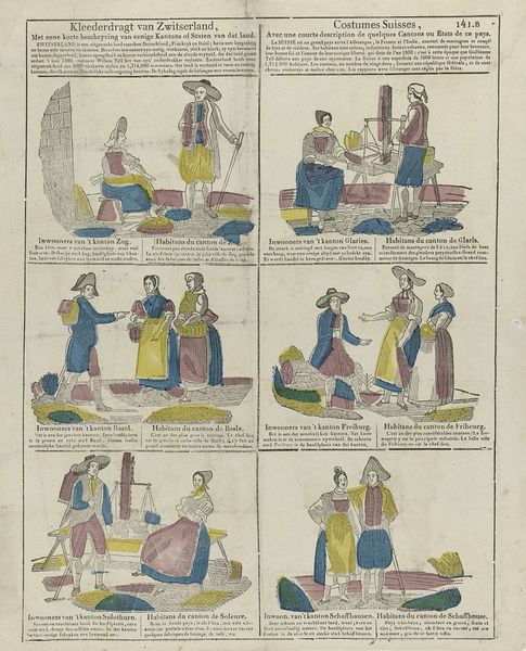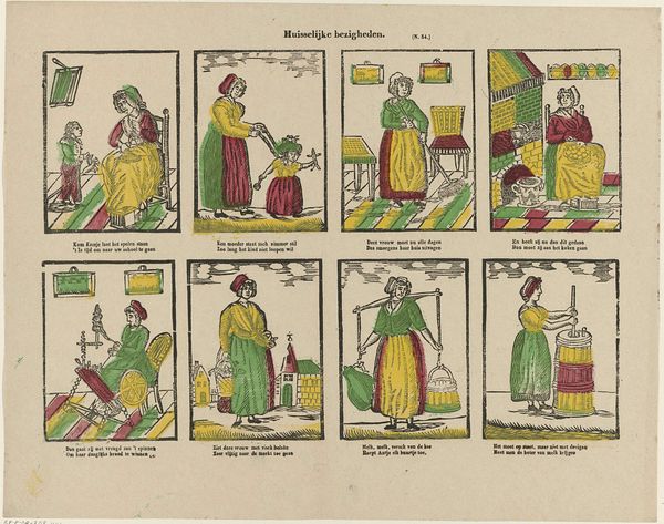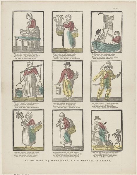 Curator: Here we have a rather charming etching and print by Philippus Jacobus Brepols, created sometime between 1800 and 1833. The title translates roughly to "Amusement, O Youth! Your Eye and Mind." It's currently held in the Rijksmuseum. Editor: My immediate reaction is to the layout. Eight separate scenes, almost like a storyboard or early comic strip, all on one sheet. And that faint hand-coloring. It speaks of a modest production. Curator: Indeed, and each little scene tells a story, often about youthful folly or lessons to be learned. See the figure in the upper left with his hands tucked into his waistband? A warning against idleness perhaps. The symbols speak volumes: boats hinting at voyages, houses hinting at home and future stability, food pointing to the consequences of industry. Editor: The materials and process are crucial to understanding its reach. An etching printed onto paper meant a wider audience than, say, an oil painting for the wealthy. Each image reflects labor: consider the people selling wares and moving stock, a clear reference to contemporary economy, right? Curator: Precisely. This wasn't about glorifying aristocracy; it was about reflecting everyday life and imparting moral lessons to the burgeoning middle class through the appeal of genre painting. Editor: And each small hand-tinted etching likely different, no exact duplication but small variation based on individual human hands. An interesting blend of mass production and human touch. Curator: Note also how certain clothing choices reflect regional Dutch traditions: the bonnets, puffed pants, shawls… These would have held specific meanings for those familiar with different towns. The whole artwork functions as both a celebration and gentle critique of local culture. Editor: Exactly, the deliberate choice of subject and method suggests accessibility. Printed for education and a new kind of visual language intended to disseminate messages. Curator: And look at the text beneath each image; a short rhyming couplet to underscore the moral. Brepols has really layered meaning onto meaning here, hoping for clarity. Editor: So much implied activity—so much implied consumption. And we are still consuming it today. Interesting. Curator: Seeing these archetypes within the print allows me to reflect on what persists through generations and the enduring concerns of society. Editor: And examining how it was made illuminates the societal dynamics that give form to art's message and ensures its preservation.