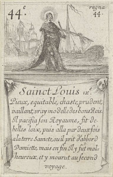 This small etching of Lodewijk VIII, crafted by Stefano della Bella, presents us with a figure cloaked in majesty, his back turned, yet radiating authority through the sheer weight of his robes. The scepter he holds, though understated, speaks of power and dominion. Consider the motif of the ruler's back— a deliberate choice, suggesting not avoidance, but rather an introspective gaze towards the future of his realm. This posture echoes in countless royal portraits across Europe, each a variation on the theme of leadership and responsibility. Think of the Roman emperors, often depicted in profile, their faces stoic masks of power, or even the Byzantine mosaics, where emperors gaze outward, symbols of divine authority. The weight of his office is represented in the cloak, a common reference in classical and later iconography that shows that burden of leadership and responsibility for a nation is a heavy one. This image resonates with the collective memory of governance, of the psychological burden carried by those in power, a burden that transcends time and culture. It is an interesting representation of the constant shifting of power and the role of the leader in society.