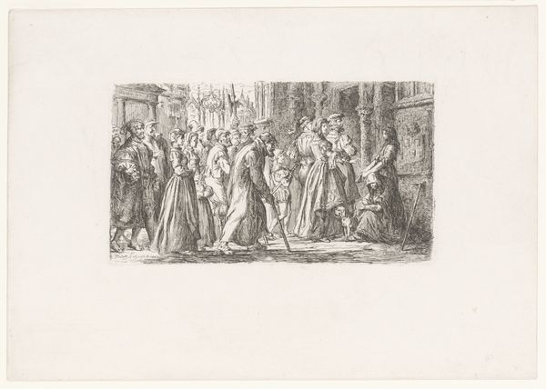 Curator: This engraving from 1819 by Louis Pierre Henriquel-Dupont, residing here at the Rijksmuseum, depicts "The Reception of King Henry IV in Paris." It's quite the historical snapshot, wouldn't you agree? Editor: A snapshot printed on paper. I'm intrigued by how Dupont translated this grand event through the precise labour of engraving, meticulously transforming a likely more vibrant source painting, into this stark monochrome scene. Curator: Stark, perhaps, but it also has a theatrical quality to it. Look at the drama of the figures, the heightened emotion… It almost feels like a stage play. Editor: Precisely. Consider the societal function of this print, manufactured en masse and distributed. The work idealises royalty, solidifying a specific historical narrative through reproduction. Was the paper itself locally sourced or from further afield, adding to production costs? Curator: Material concerns, as always! But beyond that, observe how the artist uses light and shadow to draw our eye directly to King Henry IV. It's masterful, in its own way. Don't you find it romantically idealized? Editor: Perhaps. But to whose benefit? Dupont's skillful manipulation of line and tone serves a particular ideology and also serves to bolster the demand for engraved prints – how did those conditions enable his success? Curator: The crowd seems quite taken by the king's arrival. Look at them, clamouring to see him, with what seems like sheer elation. You almost feel caught up in it yourself. It speaks to our longing for leadership and heroism. Or perhaps just entertainment. Editor: Entertainment, certainly, circulated through accessible formats. But let’s consider the skilled engravers laboring over these plates to translate paint to print; it reveals an economic system that is far from ethereal. It brings forth more practical conditions. Curator: So, we have delved into history and materials, from ink and paper to the very ideologies shaping such grand celebrations, revealing complex dialogues about power, access, and cultural memory embedded in something that might, at first glance, seem a straightforward image. Editor: Exactly. An apparently simple historical depiction reveals hidden strata of societal mechanisms if we only question its fabrication.