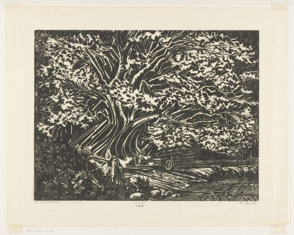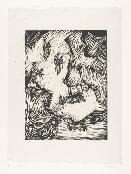 Janus de Winter created this woodcut, "Struikgewas met hagedis en nachtvlinder," where the entire process feels laid bare. You can almost feel the artist’s hand moving through the block, carving out each blade of grass. The black and white contrast gives it a stark, graphic quality, but it’s the textures that really grab you. Look closely, and you’ll see how the artist used different marks to describe the leaves, the flowers, and the lizard. The leaves on the left have a light, airy feel, which contrasts with the snake-like body of the lizard on the right. The vertical marks in the background are almost oppressive in the way they crowd the scene. De Winter’s contemporary, M.C. Escher, also worked with woodcuts and similar themes, but where Escher sought to create impossible realities, De Winter seems to be trying to capture the strangeness of nature itself. It feels chaotic, wild, and untamed. In art, sometimes the messier, the better, right?