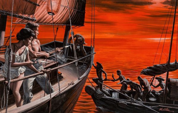 Editor: Dragan Ilić Di Vogo’s "Nezaustavljivi," created in 2009, presents a rather unusual scene executed in oil. There is this huge cliff that reminds me a bit of a gnarled tree stump emerging from the water. Perched on top, unbelievably, is a sailing ship. I'm captivated by the tension between realism and fantasy here. How do you interpret this work? Curator: I see the layering of realities. Note how the ship, traditionally a symbol of trade and colonial power, is placed atop what seems like organic detritus. The "cliff" isn't just a rock; it’s riddled with what look like manufactured candies, these saccharine forms embedded in the structure itself. Editor: Yes, it almost feels as though it is decaying. I also see a person in the bottom left, perhaps they could represent the everyman in modern society overwhelmed by all this decay. What do you make of that? Curator: I wonder if it signals the consequences of the ship's, and by extension, society's "unstoppable" journey. Consider how oil paint itself, derived from the earth, is used to depict this scene of industrial incursion and natural degradation. Does the medium reinforce the message here, underlining the extraction of resources? Editor: I hadn't considered the connection between the materials used and the commentary on society! It feels as though there's an argument for reading this less as a fantasy and more as a material history. Curator: Precisely! The very act of painting, the labor and materials involved, becomes a critical element in understanding the artist’s critique. What does the commodification of dreams through image-making say about the art market itself? Editor: It feels like it makes a grand statement, looking back I realise I made too many assumptions about surrealism and its function. Thank you, I really learned a lot looking at it in that way. Curator: The pleasure is all mine! It’s precisely this intersection of material reality and imagined possibilities that makes art so endlessly fascinating.
