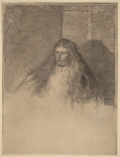 Editor: Here we have Rembrandt van Rijn's "The Great Jewish Bride," an etching from 1635, currently at The Met. It's quite striking how softly the light falls on the subject, yet the overall tone feels kind of somber, maybe even… withheld. What are your thoughts on this print? Curator: That contrast between the delicate light and underlying melancholy is central to understanding its cultural significance. In the Dutch Golden Age, portraiture served not only as a record, but as a statement of social status and civic virtue. This piece subverts that convention. Note the woman's disheveled hair, her loose garment. Is this really about depicting an idealized, aspirational image for public consumption? Editor: So you're suggesting it’s almost a critique of the traditional portrait’s role? Curator: Precisely! Rembrandt, particularly in his prints, used imagery to engage with broader social issues. "The Jewish Bride," which by the way is a more recent and possibly inaccurate title, might be inviting us to consider the place of women, particularly Jewish women within the larger Dutch society. How are they represented, and by whom? Does the "unfinished" quality of the etching contribute to that feeling? Editor: Absolutely. It makes me wonder who she was, really. Was she a specific person, or more of a type? Curator: That’s the intriguing question. Perhaps the ambiguity itself is the point, highlighting the limited scope and the restrictive cultural lens through which we see her. Editor: This has really opened my eyes. I was so focused on the technique that I missed the deeper social commentary! Curator: It's a potent reminder that art is not created in a vacuum; every stroke, every shade carries historical and social meaning. Hopefully this will encourage us all to look more closely, to question the stories that art tells, and perhaps, more importantly, the stories it omits.