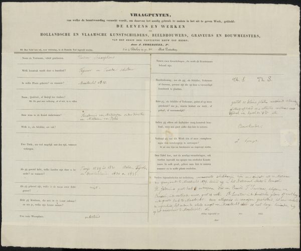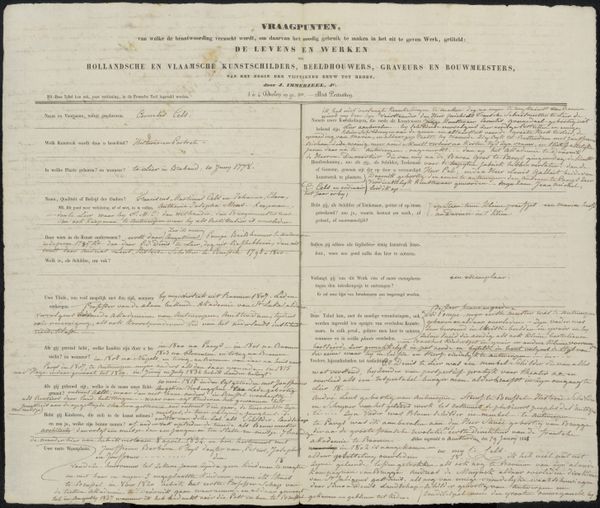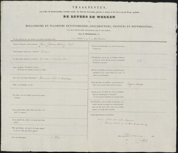 Curator: This is an intriguing object. Its seemingly straightforward presentation belies a complex network of social and material practices. What draws your eye? Editor: We're looking at an "Enquèteformulier ingevuld door Johannes Petrus Schouberg," a drawing on paper, potentially from between 1841 and 1849. It's a questionnaire of sorts, and I'm struck by the handwriting—so formal, yet intimate. How do we interpret something like this as art? Curator: Let’s consider its materiality. It's a mass-produced form, likely printed using industrial techniques, completed with ink—a handcrafted element interacting with industrial production. This tension is key. What questions does it provoke about labour and the social construction of art? Editor: I see what you mean! The form itself dictates what information is captured. Was this a common method for gathering information at the time? Was filling this form considered to be work or making art, in any sense of that word? Curator: Exactly. Its context is important. It's housed at the Rijksmuseum but blurs lines. Is it archival material, art, or both? Consider who produced it, its intended audience and circulation, to analyze the social and economic contexts surrounding artistic creation. Is it labour, a commissioned service, social record, or something more ambiguous? Editor: I hadn’t considered the interplay between mass production and individual contribution so deeply. The form and the handwritten responses – they’re each crucial to the artwork, reflecting both standardised procedures and subjective individual experience. Curator: Precisely! Examining everyday objects as cultural artifacts illuminates the systems that govern art production and consumption, challenging the very definition of art itself. We must remain critical and continue to push those boundaries! Editor: Thanks, I’m already viewing archival documents and historical research forms in a totally new light!