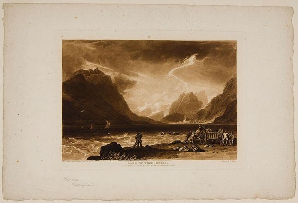 Editor: This is an etching by J.M.W. Turner, titled "Martello Towers near Bexhill, Sussex." It’s… sepia-toned and sort of brooding, but also strangely peaceful. What do you see in this piece? Curator: Well, it’s Turner, so immediately I'm thinking about light, or the lack thereof. The scene feels heavy, doesn't it? The looming cliff, the dark sky. I wonder if he's playing with the idea of England's vulnerability, the towers standing as lonely sentinels against a potential invasion. Editor: Invasion? I was just thinking about a nice day at the beach. Curator: (Laughs) Ah, yes, the beach! But Turner was always one to find the sublime in the everyday, wasn't he? Perhaps it’s both: a beautiful scene touched by a hint of unease. Editor: I guess it's a good reminder that even beauty can have a dark side. Curator: Exactly. And that’s what makes it so compelling, don’t you think?