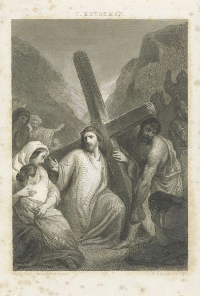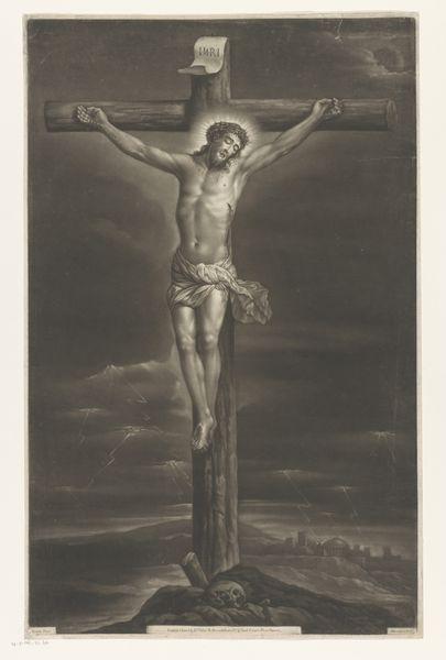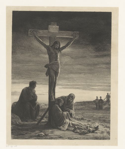 Curator: This powerful drawing is Carl Bloch’s “Christ on the Cross,” created in 1884. It’s a compelling example of his narrative work. What’s your initial take? Editor: Bleak. Utterly bleak. The charcoal really accentuates the desolation, the suffering seems so immediate. Curator: Absolutely. Bloch’s masterful use of charcoal creates a starkness that reinforces the gravity of the scene. You really sense the material suffering of labor that this represents: not only the historical work involved in producing this image, but the labor of suffering the historical figures in this event are experiencing. Look at the texture; you can almost feel the roughness of the wood, the weight of Christ’s body. Editor: And the socio-political undercurrents of displaying this scene; it was executed during a time of increasing secularization in Europe. I imagine its reception would have been quite loaded. The art institutions showcasing works like these certainly contributed to complex discussions about faith and tradition. Curator: Indeed. And the scale! You get an acute awareness of Christ’s physical ordeal when encountering this drawing, but, I see that your comment about secularization also sheds light on another labor relation here: who buys the image? Why? Who consumes the narrative of Christ and his death, and what do they intend to communicate by owning it and exhibiting it? Editor: Furthermore, consider where it's now housed, the Statens Museum for Kunst, a national art museum. It is a space for Danish cultural heritage but it’s equally enmeshed with institutional power and influence. The decision to preserve and exhibit this work contributes to a continued conversation, shaped by the curators themselves, about its ongoing cultural significance. Curator: Very well put. It speaks volumes about how we choose to remember and represent critical turning points in human history and the role the artist plays in its depiction. Editor: In the end, this dialogue reveals how Bloch's “Christ on the Cross,” is so much more than a religious image. Curator: Precisely; it is a multifaceted engagement with faith, power, labor, and materiality, constantly renegotiated through time.