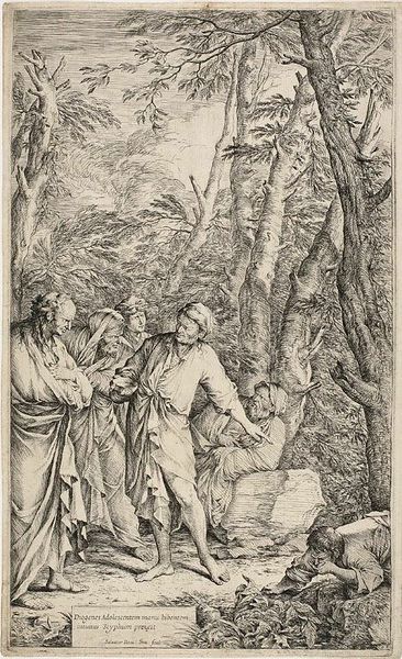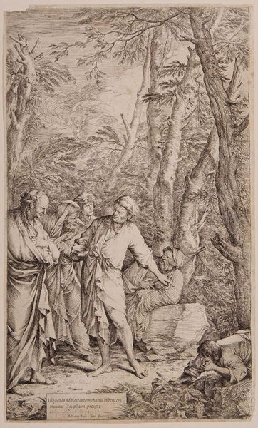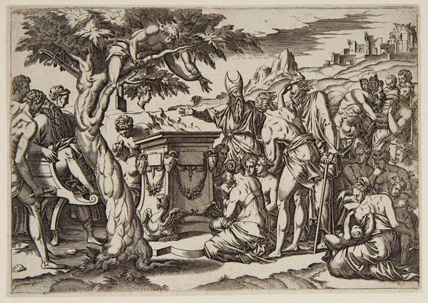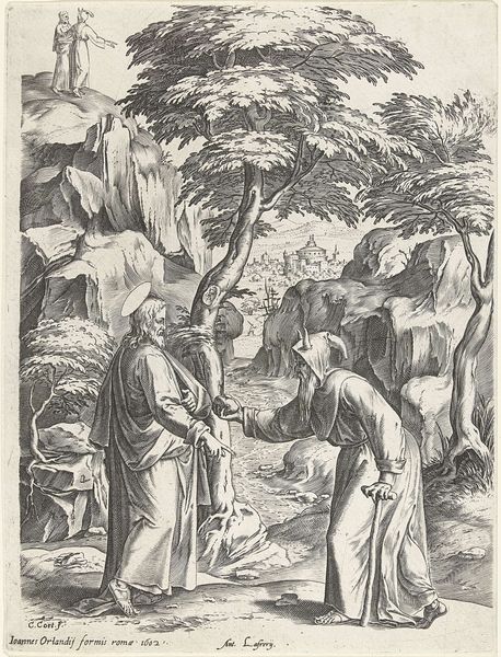 Editor: Here we have Cornelis Cort's "Temptation of Christ," a 16th-century engraving. The stark contrast really highlights the tension between the figures. What symbols jump out at you? Curator: The Devil's pointed finger, echoing Christ's own gesture, speaks volumes. Consider the halo, its circular form a well-established signifier of divinity, juxtaposed with the rugged landscape. How does this setting inform your reading? Editor: It feels desolate, like a spiritual testing ground. Curator: Precisely. The city in the background—a symbol of worldly power. Note the placement of additional figures on the cliff, witnessing from afar. Can you find any other symbols that support the narrative? Editor: I see the rocks and trees, suggesting a wild, untamed place, a place of danger. Curator: True. This image reminds us that even in isolation, our choices shape our spiritual path. Editor: I never considered how composition could reinforce such a familiar story!