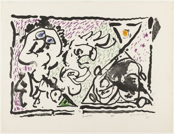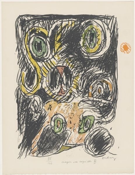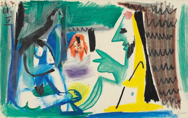 Curator: Here we have an untitled piece by Mark Rothko, likely from the early 1940s. It is rendered in watercolor and appears to relate to his "Antigone" series. Editor: It’s… heavy. Almost oppressive. The colors feel bruised, and the figures seem trapped, flattened against some unseen barrier. Curator: The framing itself seems quite deliberate, hemming in the figures. The stark outline certainly accentuates the themes of constraint present in the composition, don't you think? Also, note the distorted, almost grotesque anatomy. It pushes against traditional figurative representation. Editor: It reminds me of grief. That heavy, suffocating grief when you feel your body betrayed by sadness. Look at that yellow figure – how the face seems both present and fading simultaneously, like a half-remembered dream. Curator: Precisely. The emotionality arises directly from these distortions and bold color choices; the hues serve as a raw visual language of intense human experiences. I believe the positioning of the figures reveals a complex interplay of power and vulnerability through visual tension and stark geometries. Editor: I like how the vulnerability is conveyed—those almost tentative lines. They add to the overall sense of instability and raw emotion. I see hints of struggle and suppressed narratives, maybe Rothko's attempt to grapple with deep emotional depths. Curator: He captures that interiority— the unsaid anxieties, struggles, and even small moments of beauty flickering within. The ambiguity of these forms compels us to ask: What narratives hide within them? The incompleteness of these works, both formally and conceptually, is absolutely central to their power. Editor: Right. Leaving so much unsaid gives the viewer a sense of authorship to fill in the story of what has not been told and invites the viewers to share their interpretations and projections with their life's happenings, perhaps. What would be seen differently should this image adopt other media forms and tools. Curator: Absolutely! Well, I feel as if that brief discussion unveiled so much about this incredible work and the artist's genius for conveying emotion! Editor: Indeed! A remarkable reflection. The beauty of these pieces lie precisely in their capacity to resonate so differently and individually for everyone.
