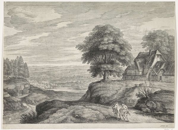 Editor: This is "Gezicht op Linkebeek," a cityscape rendering from sometime between 1653 and 1665, made with ink on paper, by Ignatius van der Stock. It’s pretty busy but also muted... what a curious mix. What's your take on it? Curator: Busy is one way to describe a Van der Stock, darling. To me, it's more about the world breathing on a page. Look at how the artist manages to create depth in this limited palette. You've got the foreground foliage, the house nestled into the hill... it all leads our eye into the hazy distance. Editor: Yes, and the two figures on the road create depth in the landscape and maybe suggest daily life in Linkebeek? Curator: Exactly! Think of those burghers going about their day, their lives part of the greater fabric of the city. And doesn’t the intricacy remind you of peering through a lace curtain? What's concealed is just as alluring as what's revealed. Van der Stock wasn't simply mapping a place. Editor: You're right; it does feel like more than just a rendering. I can see that there are a lot of lines at the edge of the buildings that indicate age and texture. Curator: The line work carries the energy of nature! The lines even mirror life, you know? Strong strokes representing solid objects; delicate lines capturing whispers of foliage, and the barest trace of light dancing on the river. Editor: Now I'm thinking about what's going on *outside* the lines, what isn’t drawn. This piece shows such care that makes me want to try pen-ink drawing. Thanks for shifting my view. Curator: The pleasure is mine! Never be afraid to leap beyond the frame, my dear, whether you're drawing it or merely dreaming it.