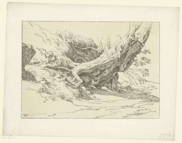 Curator: Looking at this small drawing by Henri François Schaefels, titled "Driemaster slaat tegen de rotsen"—"Three-master Crashes Against the Rocks," from sometime between 1837 and 1879—I immediately get a feeling of controlled chaos, would you agree? Editor: Absolutely. It's incredibly dynamic despite being monochromatic. The use of line to convey both the violence of the storm and the precariousness of human existence is striking. You know, shipwrecks weren't just tragedies; they were a potent symbol in 19th-century art, reflecting anxieties about industrialization and the power of nature. Curator: Yes, anxieties that run pretty deep. It's fascinating how Schaefels manages to capture the raw energy of the sea with what seems like a fairly simple technique. The wild hatching that creates the waves gives the impression that everything is unstable. Look how fragile the ship appears, practically impaled on the rocks, and look at the helpless figures scrambling onshore. It's almost comical, like a play, as if it's saying this too shall pass. Editor: It definitely speaks to the sublime, that Romantic era obsession with nature's overwhelming power, but I see something more cynical here too. Think about the colonial context—ships representing trade, conquest, exploitation… a shipwreck could be read as a critique of those systems, a kind of poetic justice enacted by nature itself. Or is that perhaps going a little too far? Curator: It’s something to consider. For me, though, I'm stuck on the etching quality. It creates a dramatic mood and a sense of almost desperate urgency in what we are seeing. It's not a pretty picture, is it? This feels closer to a scream. Editor: You're right. And the figures aren't idealized heroes, they’re just trying to survive. And isn't it interesting how he gives as much weight to the water as he does the rock? Curator: It suggests the sea is as powerful as any land, always pushing, always trying. So, thinking about this drawing overall... the detail and immediacy capture you; its simple strokes remind you of the brutal but somehow expected fight for human survival. Editor: Indeed. Seeing it through this lens brings such a new appreciation, or perhaps I should say understanding, to Schaefels’ stark statement. It's a visceral portrayal that's as relevant today as it was back then, I suspect.