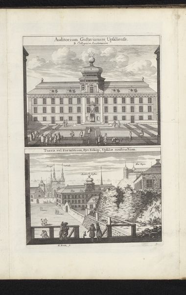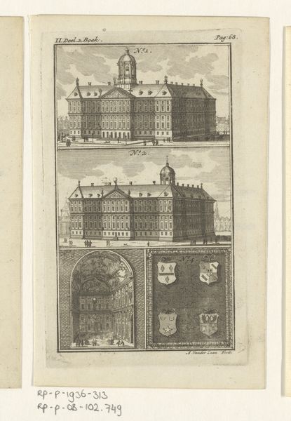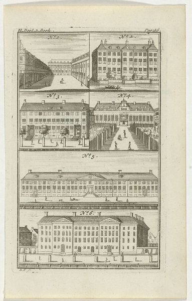 Curator: Hmm, there’s something undeniably orderly about this one... it reminds me of dollhouses. Editor: That's exactly it. What you're seeing is an engraving titled "Vijf verschillende gebouwen te Amsterdam," or "Five Different Buildings in Amsterdam" created around 1723 by Jacob Folkema. Curator: Right, yes! These are like architectural portraits, so stoic and posed. What’s striking is the… sameness, and precision of each one, laid out like specimens. All those tiny windows—it's almost mesmerizing in its monotony. Editor: Consider how Folkema is showcasing the facades with such meticulous detail. It's all about line, isn’t it? A demonstration of technique using repetition and perspective, giving us a rational presentation, emphasizing the geometric understructure that is very specific to Dutch Golden Age cityscapes. Curator: So, precision over personality then? I feel a strange tension here—wanting to know the life *within* each structure versus admiring the *outer* shell. Like those gorgeous, yet somehow lifeless, architectural drawings of the time. Editor: But don't you think that tension, the structured facades versus the life implied within, IS the point? We see architecture as this solid, stable thing but it's always interacting with—and shaped by—the ever-changing world around it. Even the calm surface here suggests layers beneath. Curator: True. It's like looking at a neatly folded map that promises adventure… but only reveals the surface, not the journey itself. You need to venture past those perfect lines! Editor: So perhaps it's a invitation to a voyage then—one of seeing Amsterdam itself. Folkema's engraving really exemplifies how this era saw architecture as both form and function and something tied inextricably to social life. It’s all connected in a very structural and thoughtful way, something to consider for your next exploration of the city. Curator: Precisely; a framework inviting you to look deeper and discover Amsterdam's hidden realities. I see now there’s beauty to discover both within and outside Folkema’s calculated world of architecture.