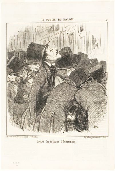 Editor: This lithograph by Honoré Daumier, titled 'Artistes en train d'examiner...', roughly translating to 'Artists Examining...', is from the 19th century. It shows a crowd of people looking at artwork on a wall. The style is caricatural, quite satirical. I'm struck by the contrast between the faceless crowd and the two men at the front with their exaggerated features. What's your take? Curator: Daumier was a master of social commentary through prints. It's essential to remember that 'Le Public du Salon' indicates this print appeared in a publication about the Paris Salon, a state-sponsored art exhibition that held significant cultural and political power. The exaggeration, as you noticed, plays a key role here. Consider how the caricature operates. Is it merely humorous? Or is Daumier critiquing the art world itself? Editor: It definitely feels like a critique. Are those two men in the front supposed to be artists themselves, jealously scrutinizing a rival's work, as the title suggests? Curator: Precisely! The focus on their expressions, especially their intense scrutiny, highlights a certain rivalry and perhaps even pettiness within the artistic community. Daumier uses realism to depict the scene, but imbues it with an almost grotesque exaggeration that critiques social behaviors and institutional practices within the art world. How might the anonymity of the rest of the crowd play into that critique? Editor: Perhaps they represent the uncritical, consuming public, in contrast to the artists' professional, yet maybe biased, perspective? Curator: Exactly. Daumier's art frequently explores this dynamic—the tension between the artist, the institution, and the audience. It's a powerful example of how art can be used as a mirror, reflecting back the social and political realities of the time. Editor: I didn't think of it that way before, I now can recognize the institutional critique it holds. Thanks, that gave me a completely different perspective. Curator: You're welcome. I'm glad to have shed a different light and offered a fresh context.