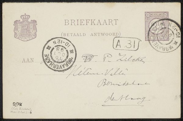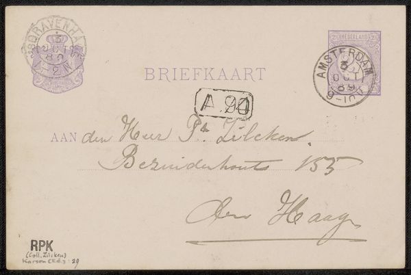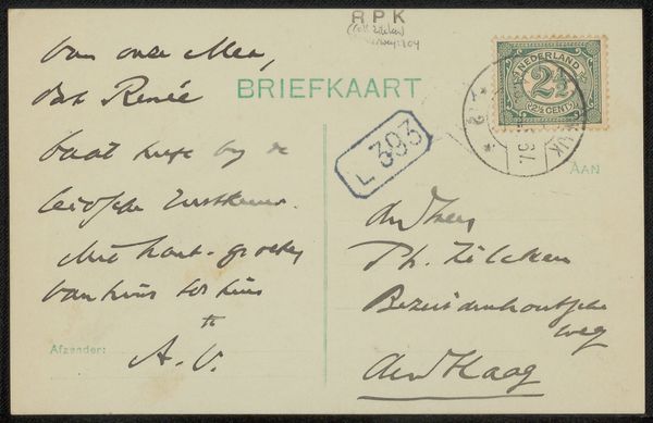 Editor: Okay, so this is "Briefkaart aan Pieter Haverkorn van Rijsewijk," a mixed-media drawing on paper by Marinus van der Maarel, created sometime before 1919. It's essentially a postcard, and something about the handwriting and the stamp really evokes a sense of faded history. What stands out to you about this piece? Curator: It whispers stories, doesn’t it? More than just delivering a message, this little rectangle of paper offers a peek into a life, a connection. I'm drawn to the way the rigid formality of the pre-printed "BRIEFKAART" clashes with the cursive script. Imagine the hand that held this, penning a quick note, a casual hello to someone. What do you think they might have been writing? Editor: That’s a great question! I wish I could read Dutch script better. I suppose, seeing as it's just a postcard, it might have been fairly banal, daily stuff. Curator: Perhaps. Or maybe it was an invitation, a secret shared. Notice the faded stamp, a portal to a different time. Does it remind you of any contemporary forms of communication? Is anything analogous? Editor: I guess the closest thing would be an email. Quick, cheap. But without the inherent… materiality of something you can hold. Curator: Precisely. The ephemeral versus the tangible. It begs the question: what future stories will our emails whisper? What history are we creating, pixel by pixel, versus pen stroke by pen stroke? What do you think we’ll lose of this materiality by switching over to something totally non physical? Editor: Hmm. I've never thought about my emails as a future historical record. I suppose we'll lose the charm, but gain wider access. Curator: Exactly. It’s a beautiful, yet melancholy thought to see our digital forms as a means of mass and potentially fast distribution for communication but maybe in turn lose the value that history imbues within analogue, ‘fixed in place’ art. Editor: Well, that’s given me something new to ponder today! Thanks!