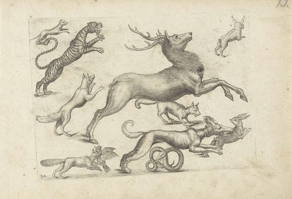 Curator: Jacques Callot's "Horses Running Free" presents a dynamic scene etched onto a small plate, only about 5.7 by 8.3 centimeters. Editor: There's a frantic energy despite its size. The horses appear almost suspended, caught mid-gallop against a stark background. Curator: Indeed, Callot was renowned for his etching technique. Consider the labor, each line precisely cut into the metal plate, then inked and pressed. Editor: The linearity is striking. The formal composition of the bodies almost seem like symbolic representations of power and wildness. Curator: The availability of the print itself allowed for broader dissemination of these symbols, shaping perceptions of nobility and freedom. Editor: I see it as a study of dynamic forms, each horse a slightly different pose, creating rhythm and visual interest on a miniature scale. Curator: Understanding the socio-economic conditions in which this work was created helps us really appreciate the piece. Editor: Perhaps! But for me, the arrangement of lines and forms evokes a sensation of movement and a certain contained chaos. Curator: Fascinating, how a focus on production can offer different points of view. Editor: Precisely! It just goes to show that both form and context contribute to a full understanding.