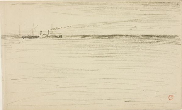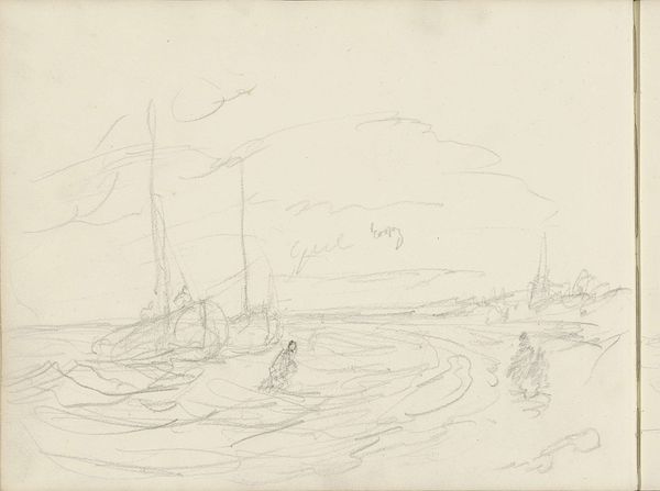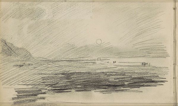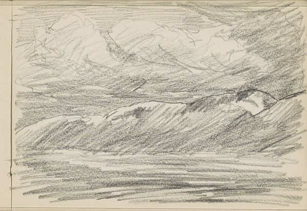 Editor: Here we have Alexander Shilling’s “Havenhoofd te Scheveningen,” created in 1908 using pencil and ink. The sketch feels incredibly dynamic. What structural elements stand out to you in this piece? Curator: Immediately, the composition. Notice how the horizon line isn't quite centered. It creates a tension, almost a visual imbalance. Shilling also uses diagonal lines for the waves and the sky which adds a sense of depth and movement. Look closely at the mark-making. Editor: Yes, the varying pressure on the pencil to create such textured effects is beautiful! Curator: Precisely. The contrast between the darker, more defined lines of the harbor structures and the lighter, almost ethereal quality of the sky and sea, contributes to the overall mood. Are the cloud formations distinct from the representation of the waves? Editor: Definitely! They seem weightless. It makes me think about how he wanted to explore the relationships between air and water through those tonal variations. What is it you think he tried to accomplish through the light play here? Curator: The strategic deployment of light accentuates specific areas, namely the harbor elements, thereby structuring a visual pathway across the paper. Shilling contrasts zones of intense shadow, achieved with concentrated ink application, with regions rendered lightly with the pencil. It provides depth and structure, wouldn't you agree? Editor: I see what you mean, creating form out of contrast alone. It is interesting how an incomplete landscape manages to communicate the location. It feels very effective given the limited number of materials at play. Thanks for helping me analyze Shilling's strategy! Curator: Indeed, it's through observing those interactions between medium and mark that meaning truly comes to light. It’s been a pleasure to discuss it with you!