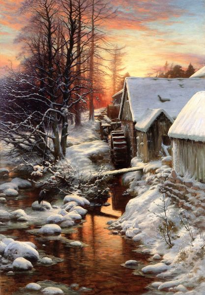 Editor: This is Joseph Farquharson’s "A Winter's Morning," an oil painting that just… whispers. It feels so still and cold, and that sunrise casts such a fragile, ethereal light. What do you notice first when you look at it? Curator: The sheer blanket of silence, I think. Farquharson’s snow isn’t just white; it’s a masterclass in capturing light, shadows, and the texture of untouched drifts. Notice how the sun’s almost shy kiss on the snow transforms the mundane into something truly sublime. Tell me, what feelings does that stark contrast of cold and light evoke in you? Editor: A kind of hopeful resignation, maybe? The scene is beautiful, but undeniably harsh. Curator: Exactly. It’s the romantic in us versus the realist. Farquharson wasn't just painting a pretty picture. He spent winters in Scotland, sketching en plein air in freezing temperatures – that commitment echoes in the chill we feel just by looking at it. He shows us the unvarnished truth of the natural world, but through a lens of profound beauty. See how even the crows seem pensive, almost burdened by the landscape. Editor: It definitely makes me appreciate the dedication involved! I guess I didn’t really consider the physical effort that went into capturing such a specific moment. Curator: And isn't that part of the magic? We connect with not just the image, but the artist’s experience, braving the elements to share this quiet slice of life with us. Editor: Absolutely. It's more than just a pretty winter scene; it’s a testament to perseverance, capturing beauty even in harshness. I’ll never look at a snow scene the same way. Curator: Nor I. The light shifts just slightly with each glance, reminding me there's always a new perspective to discover, if we just brave the cold a little longer.