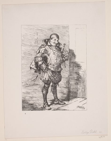 Editor: This is "En bejler," or "A Suitor," created by Balzer Dahl in 1876. It seems to be a print, perhaps a woodcut, using delicate lines and light pencil work. The character has such a quirky expression, a peculiar outfit, and overall it just feels like an odd personal sketch. What can we gather about the meaning behind it? Curator: Looking at "En bejler" through a materialist lens, let's consider the socio-economic conditions that would have enabled the production of this print. Dahl clearly had access to resources: the paper, the tools for woodcutting, and the training required. Given that this piece reads as a sketch, it brings into focus Dahl’s labour as part of artistic practice. How does the apparent ease of its execution play with your expectations about 19th-century printmaking? Editor: That’s interesting; I hadn't considered the actual effort required. It appears effortless but is probably the product of quite some time and skill with these tools. Do you think the material informs its sketch-like nature? Curator: Absolutely. The accessibility and relatively low cost of paper and pencil – or perhaps a metal stylus in this case, given the characteristics of the marks – fostered experimentation. It seems to straddle a boundary between "high art" and personal exploration. The figure, too, is not of nobility, his slightly unkempt attire hinting at a kind of lower-class satire. The flowers versus the weapon are a compelling paradox within this. What does it tell you? Editor: I suppose that if we delve into the materiality of it, maybe Dahl’s choice of a relatively accessible print method gave him freedom to experiment with subject matter that challenged the prevailing norms of the art world, where certain subjects are “appropriate.” I see this as perhaps the most engaging and surprising thing here. Curator: Indeed, so thinking about it all together, what's your understanding now of Dahl's artistic intervention within his society? Editor: I think focusing on the materiality makes this artwork much richer and I see now how printmaking processes allowed for critical commentary on class and artistic conventions that I might have missed at first.