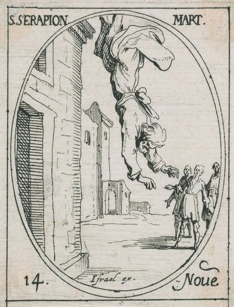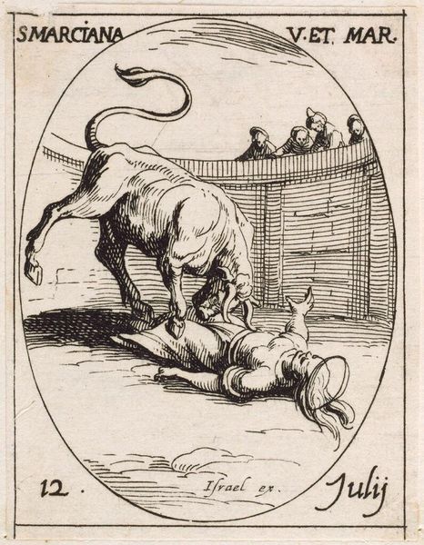 Curator: Jacques Callot's tiny etching, "Saint Marinus the Old," depicts a rather unsettling scene. It's part of a larger series on the lives of saints. Editor: My goodness, it's intensely dramatic! The cross-hatching amplifies the moment of sheer terror. Two bears mauling a man while onlookers casually observe…yikes! Curator: Right? The bears become symbolic agents of fate, or perhaps divine test. Note the contrast: the active violence below, and the passive observation above. Editor: The impassivity of those figures above is chilling. The bears might symbolize pagan forces, and Saint Marinus's ordeal signifies a spiritual trial by fire. Curator: Exactly. And the inscription "Israel ex." suggests the print was produced in France, adding another layer of historical context to its reading. Editor: Callot's ability to inject such emotion into such a small space is impressive. It makes you contemplate how suffering becomes sanctified, or even spectacle.