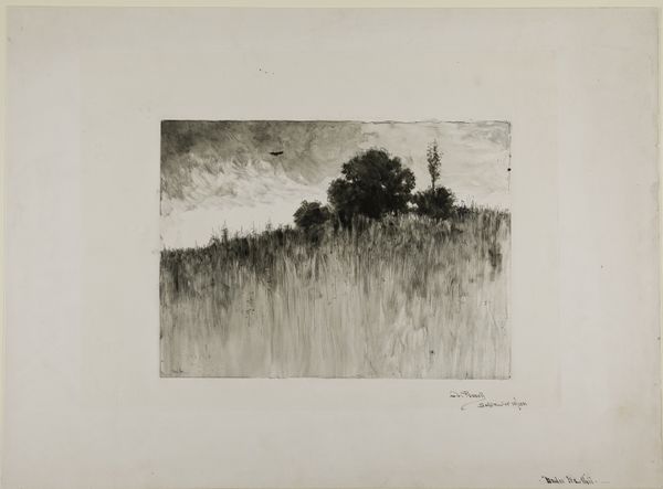 Editor: We're looking at Camille Corot's "Beneath the Trees," a lithograph from 1871 currently residing at the Art Institute of Chicago. There's almost a frenetic energy in the scribbled lines he uses. What does this work evoke for you? Curator: You know, when I look at it, I feel a kind of wild, almost untamed peace. It’s like those days when the wind whips through the trees, but down on the ground, in the heart of the woods, there's still this profound stillness. Corot captures that duality, doesn't he? Do you see how he uses shadow? Editor: Yes, the darkness definitely adds to the mood. Is it meant to feel a little unsettling, or am I reading too much into it? Curator: Perhaps a bit of both. Think of it as the sublime. Nature has this awesome, powerful aspect that's beautiful, sure, but also makes us feel small, doesn't it? A reminder of the wild heart beating just beneath the surface of things, that primal energy. You know, there's something deeply human, almost yearning in those scribbled lines too. Editor: That's fascinating. It makes me see the drawing as more than just a landscape, almost like a state of mind. Curator: Exactly! I wonder, is that a figure down there in the bottom left? It is so ambiguously placed! Maybe it isn't there at all. Corot's work really plays tricks with my perception of place. But these ambiguous elements lend so much of the work its magic. Editor: That's a wonderful point! It’s as if we're invited into this space, this almost ethereal grove, to just be still and breathe it all in. Curator: Precisely. And isn’t that the magic of art – a quiet invitation to come closer and contemplate? I really enjoyed your comment, as I hadn't previously seen this place of trees as so deeply inviting, and almost hospitable. Thank you for that.